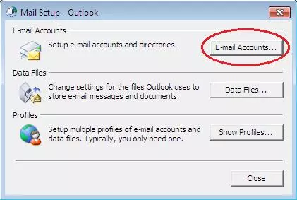 Open Control Panel and locate the Mail icon. It can be found under User Accounts. Click Mail. You will then see the following box: