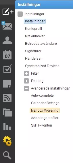 Expandera Avancerade inställningar och klicka på Mailbox Migrering i menyn som dyker upp.